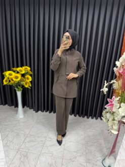 İpek Kupra Kumaş Pantolonlu Takım Kahverengi