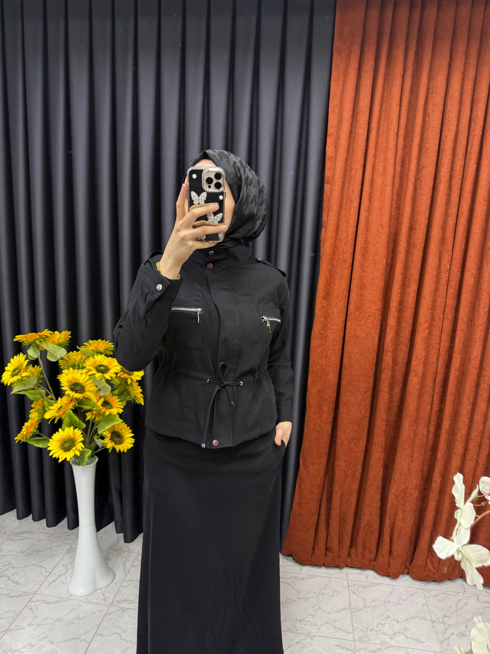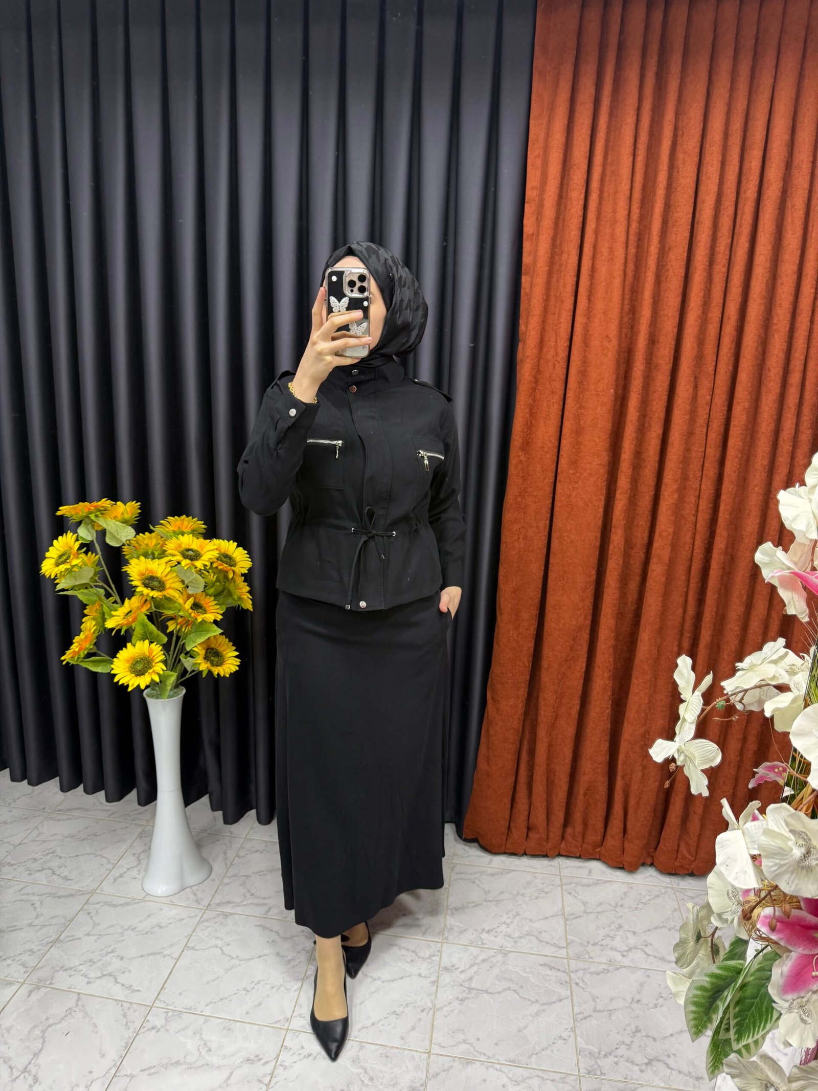 Bu özgün tasarım, farklı kullanımlar için çeşitli seçenekler sunar. Belden büzgülü etekli takım, iş toplantılarından özel davetlere kadar birçok alanda sizi rahat ve şık hissettirecek. Dilerseniz stilettolarla tamamlayarak iş hayatında profesyonel bir dokunuş ekleyebilirsiniz, dilerseniz spor ayakkabılarla günlük rutinde rahatlığı ön plana çıkarabilirsiniz. Seçim sizin!