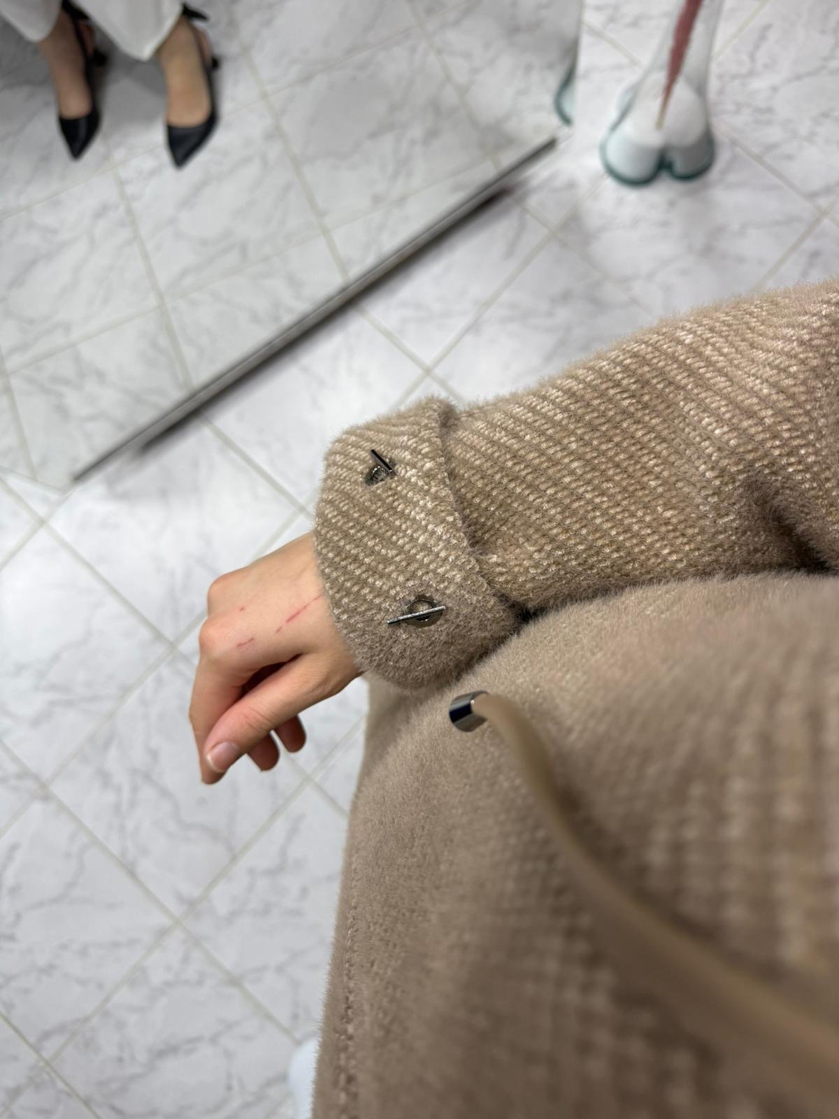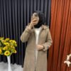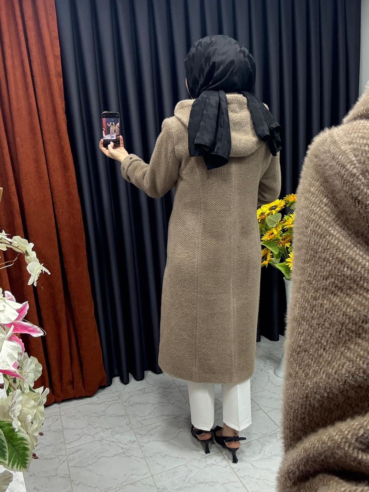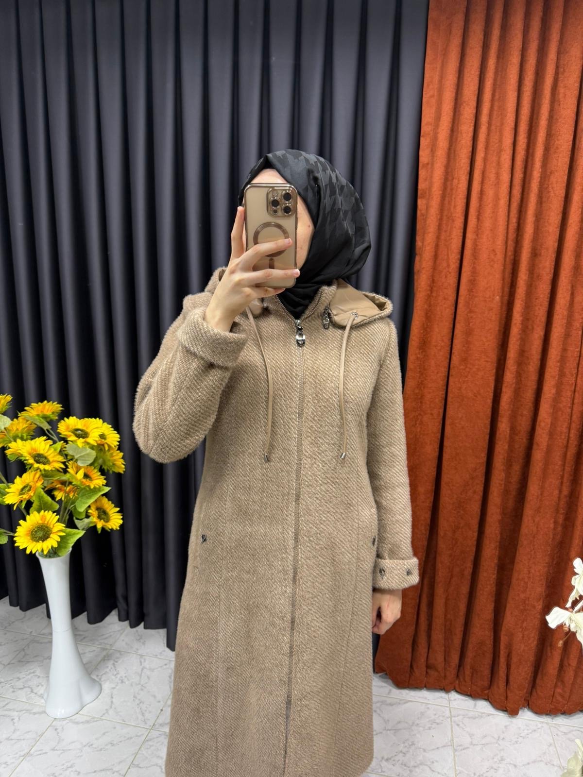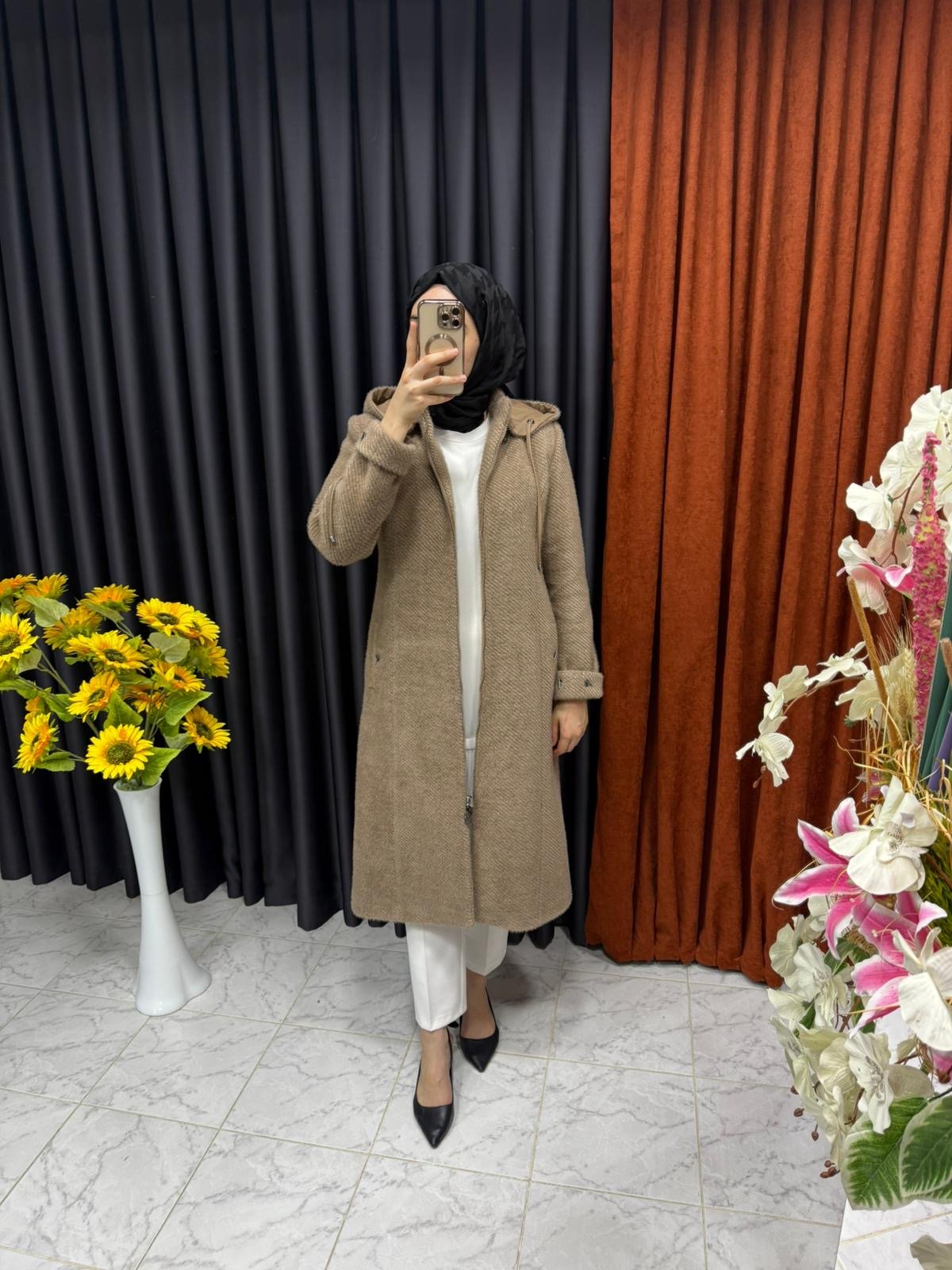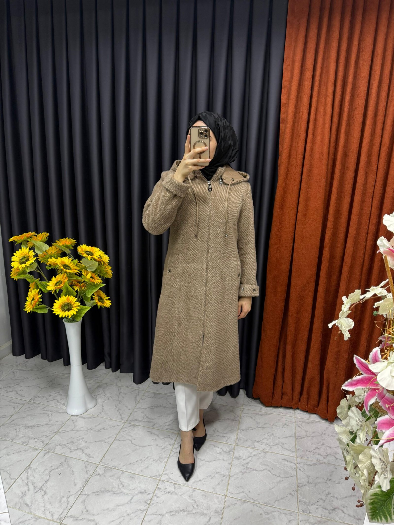 Fermuarlı Tüylü Kaşe Kumaş Kaban Bej