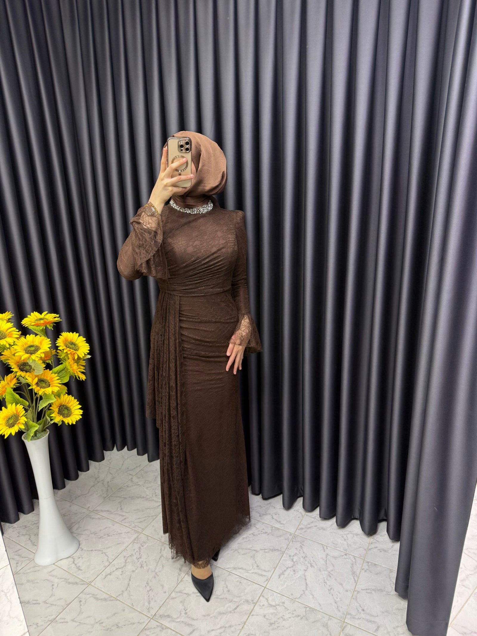 Fransız dantel balık elbise, ince işçilikle tasarlanmış ve zarafetiyle dikkat çeken bir üründür. Bu elbise, özel davetlerden düğünlere kadar farklı organizasyonlarda sofistike bir görünüm elde etmek isteyenlerin tercihi olacak şekilde tasarlanmıştır. Balık kesimiyle vücudu nazikçe saran yapı, feminen hatları vurgularken dantel detayları romantik bir dokunuş katmaktadır.