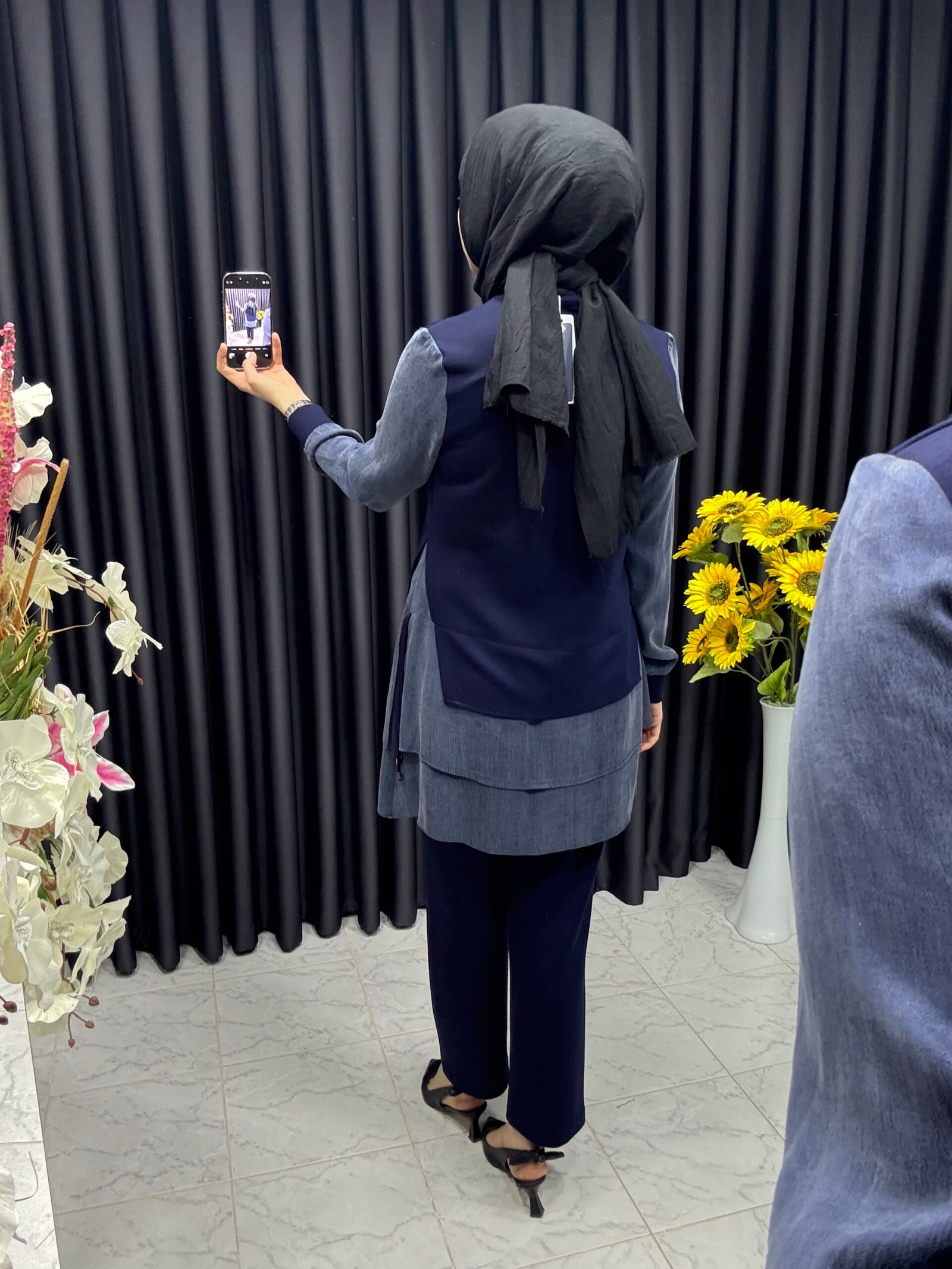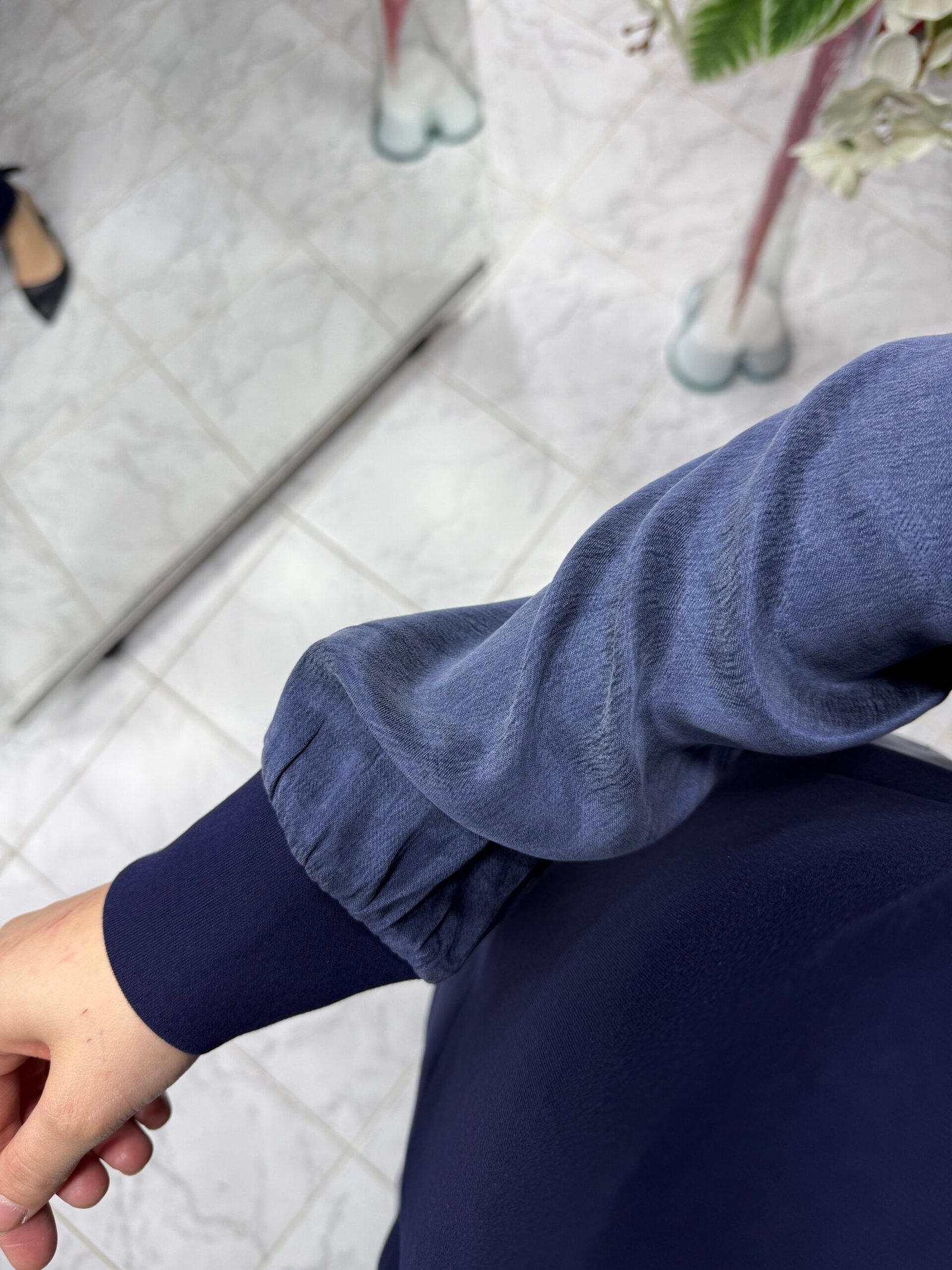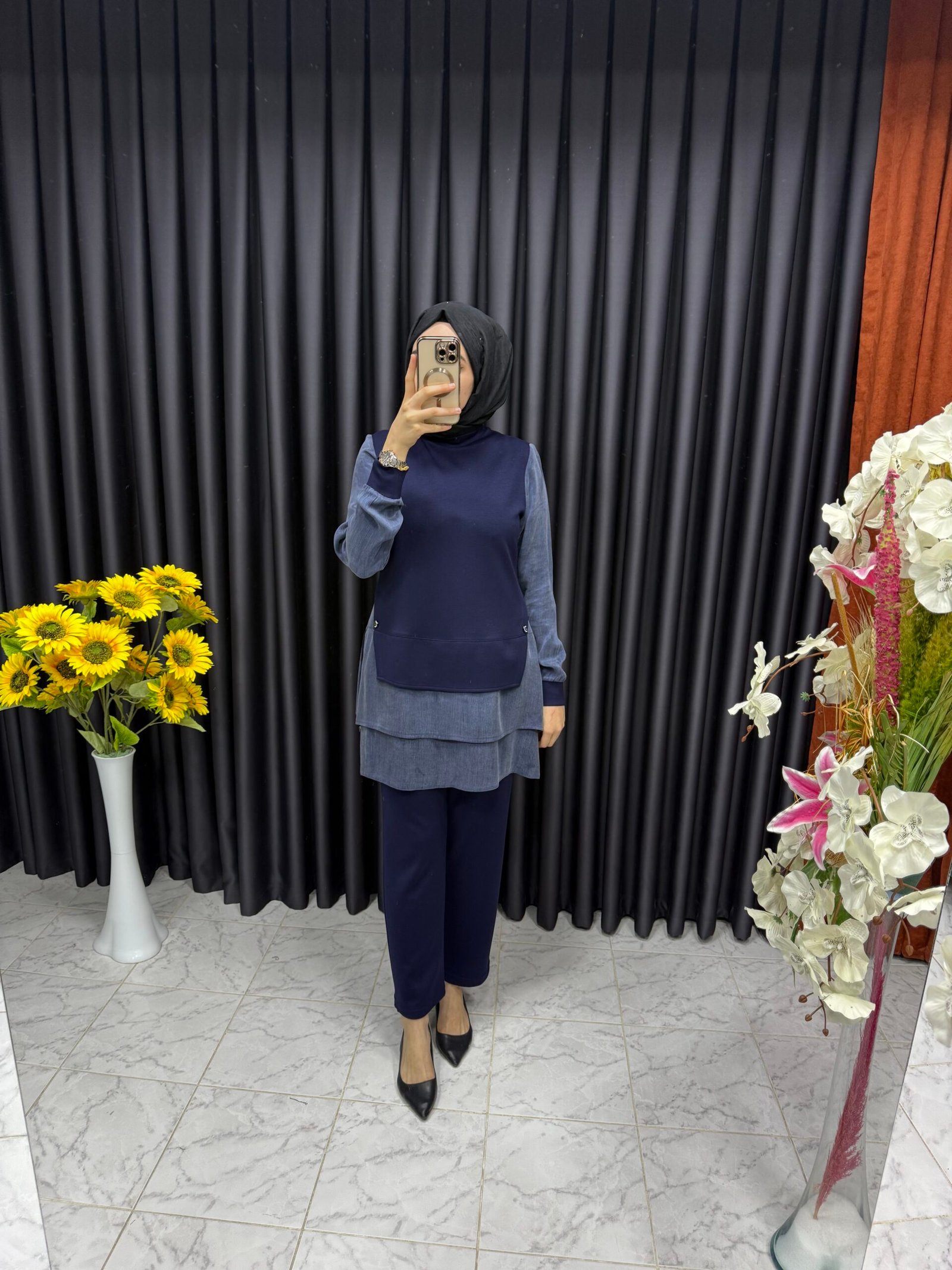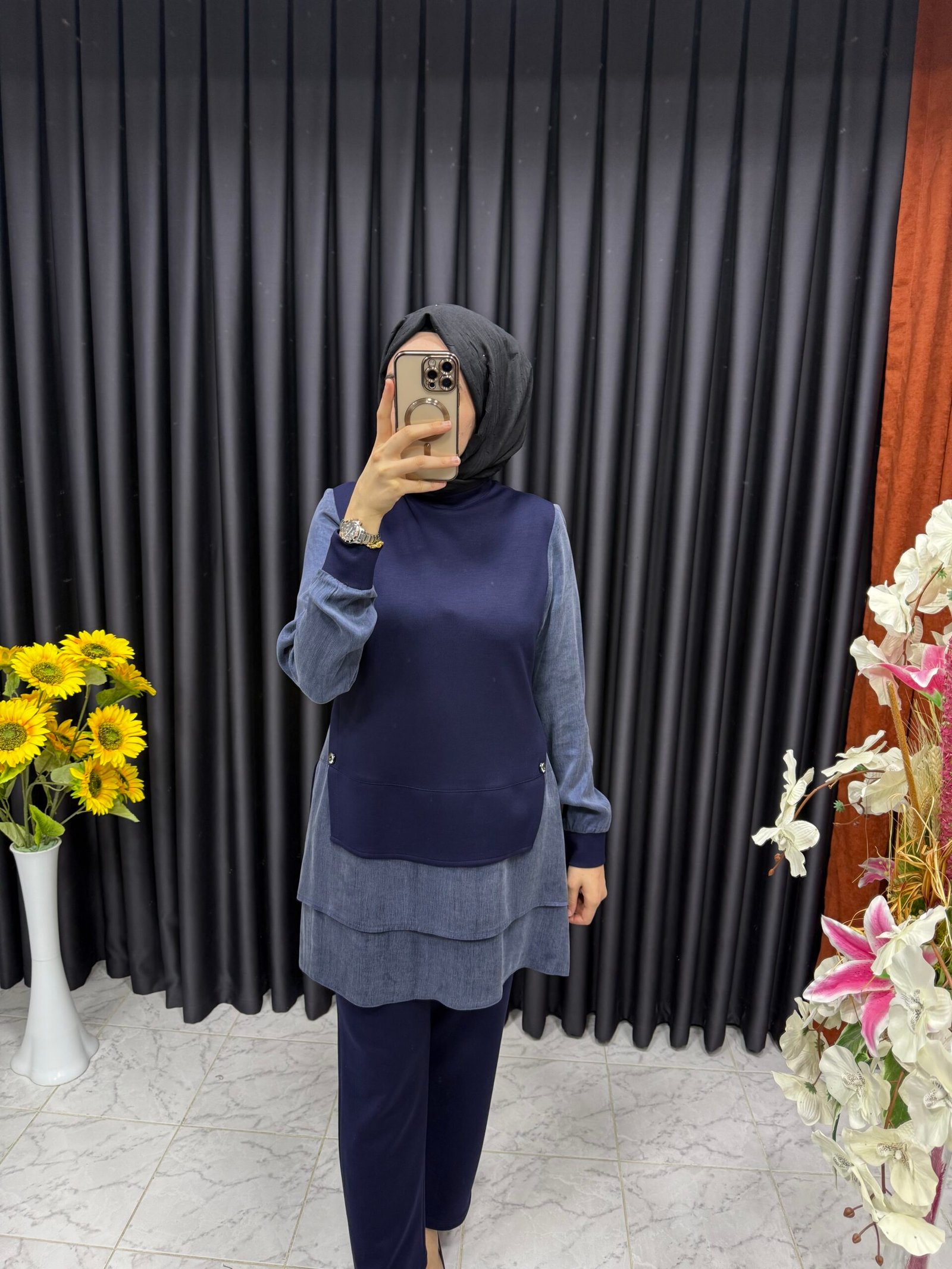 İpek Kupa Detaylı Fırfırlı Tunikli Takım Lacivert