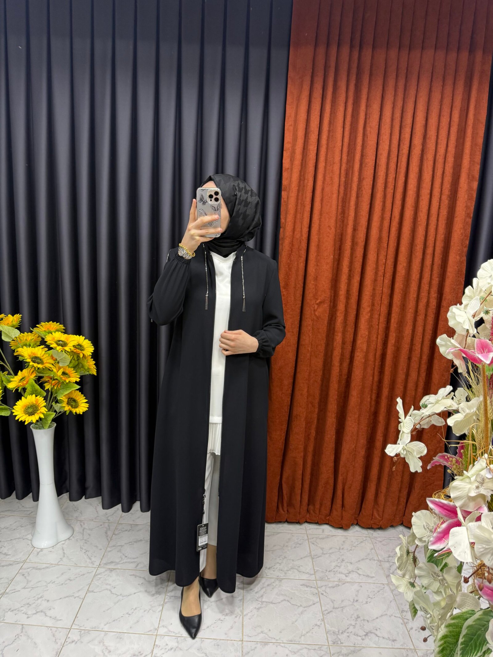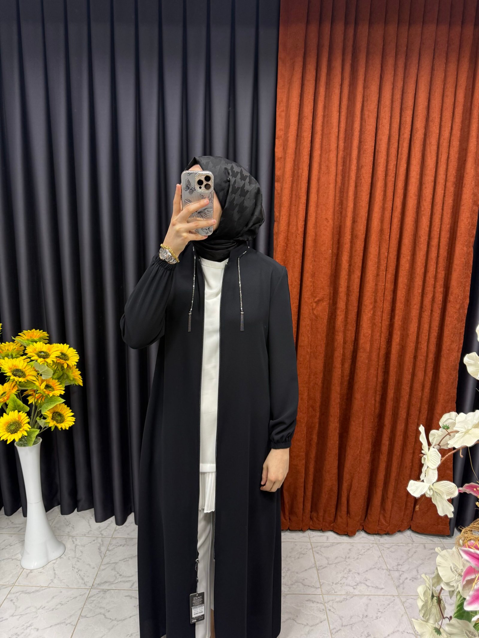 Bu ferace, üstün kaliteli kumaşlardan üretilerek hem estetik hem de konfor vaat eder. Hafif ve nefes alabilen malzemesi sayesinde gün boyunca rahatlıkla kullanılabilir. Kapşon detayı spor bir görünüm sağlayarak feracenin çok yönlülüğünü ön plana çıkarır. Boncuk işlemeler ise sofistike dokunuşlarla şıklığı zirveye taşıyor.
