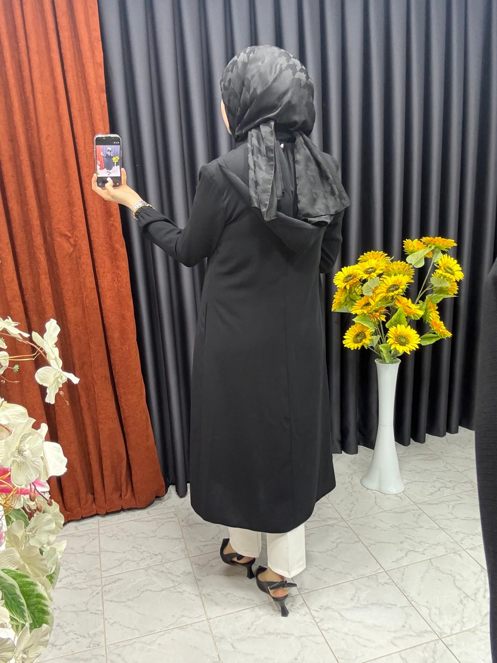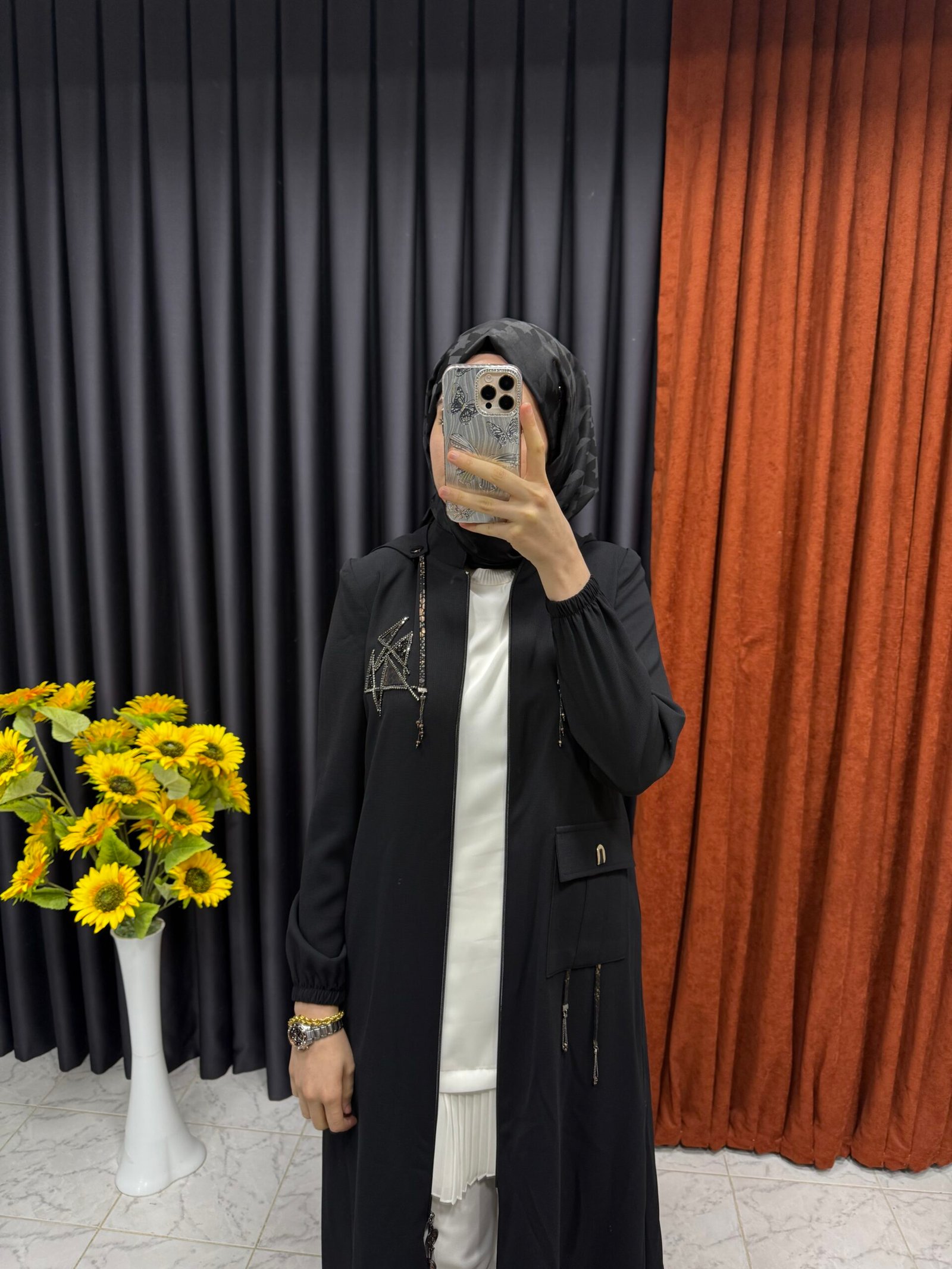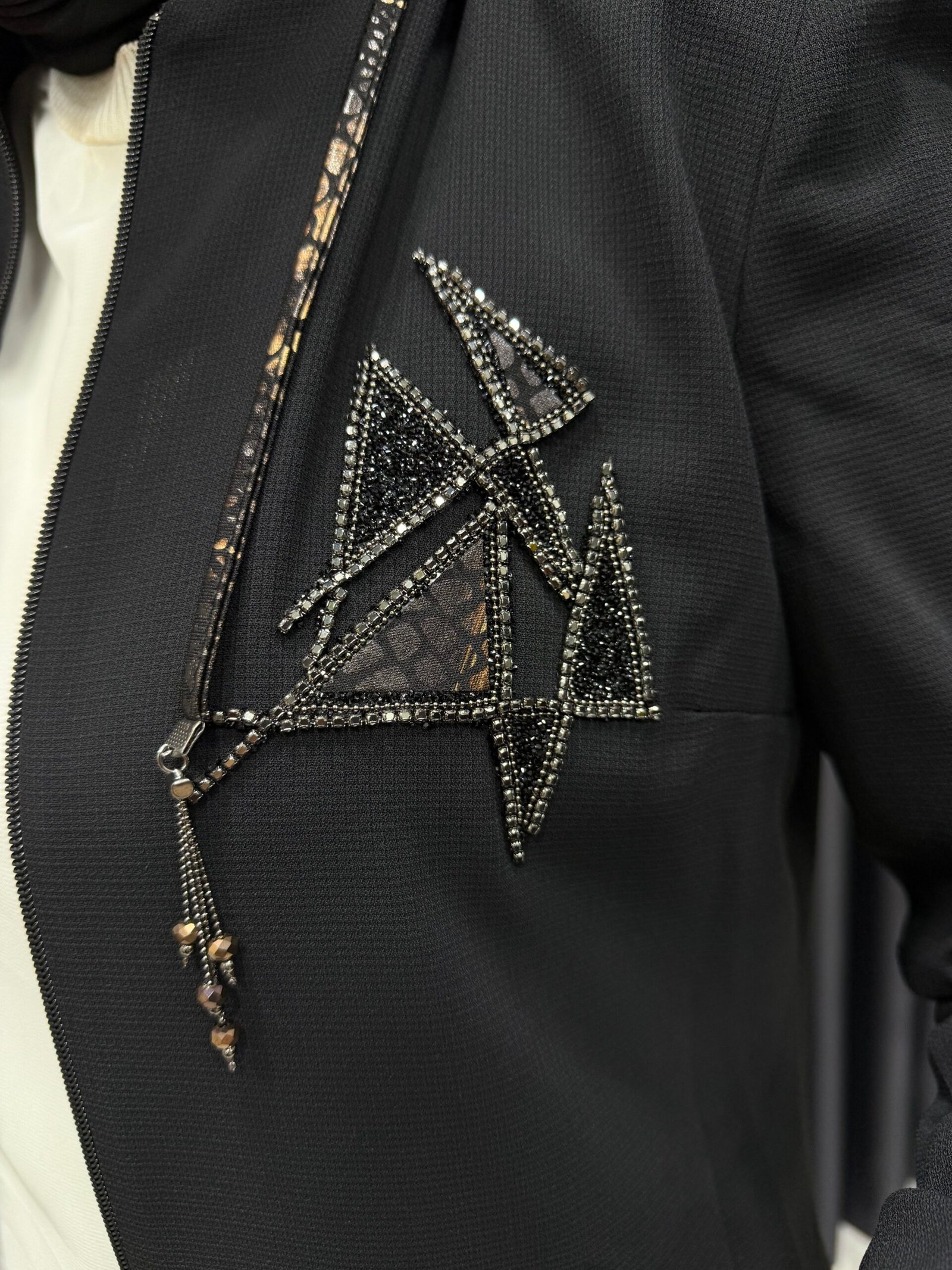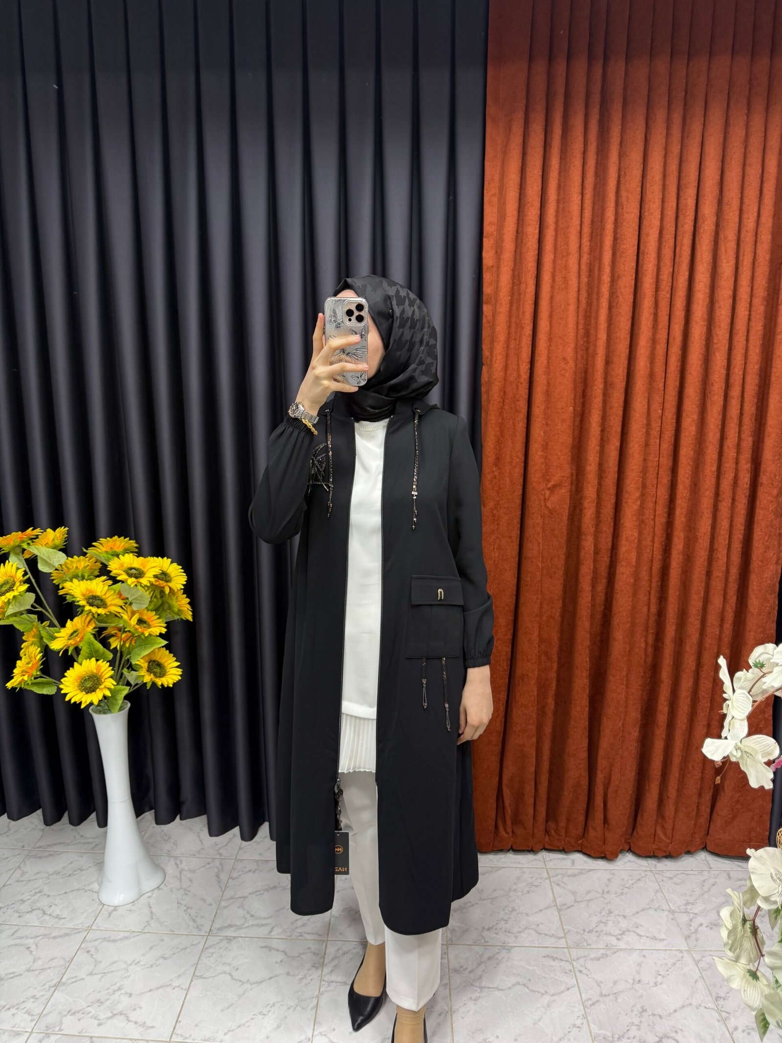 Kolları Şerit İşlemeli Kapüşonlu Giyçık Siyah
