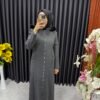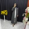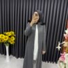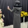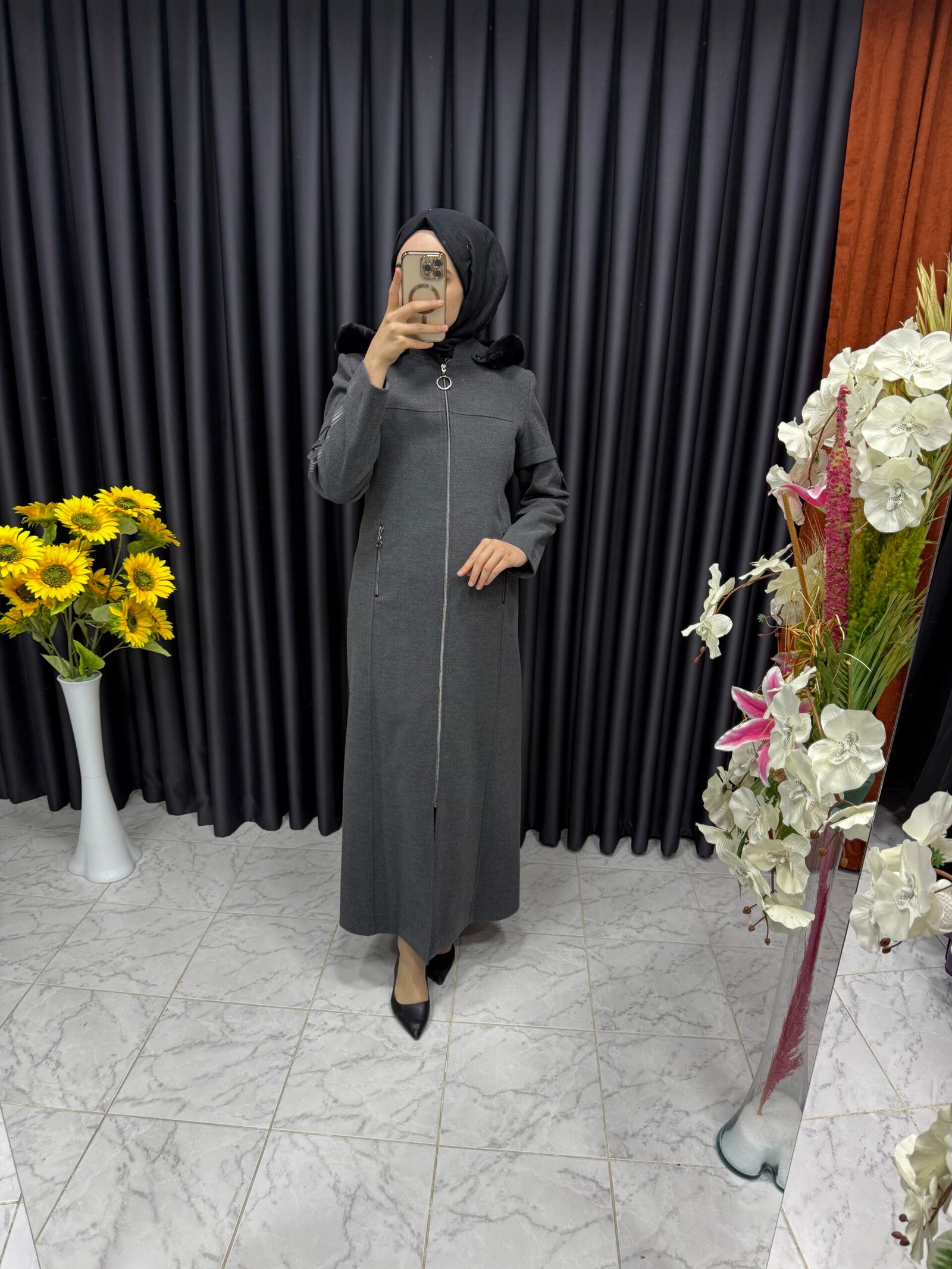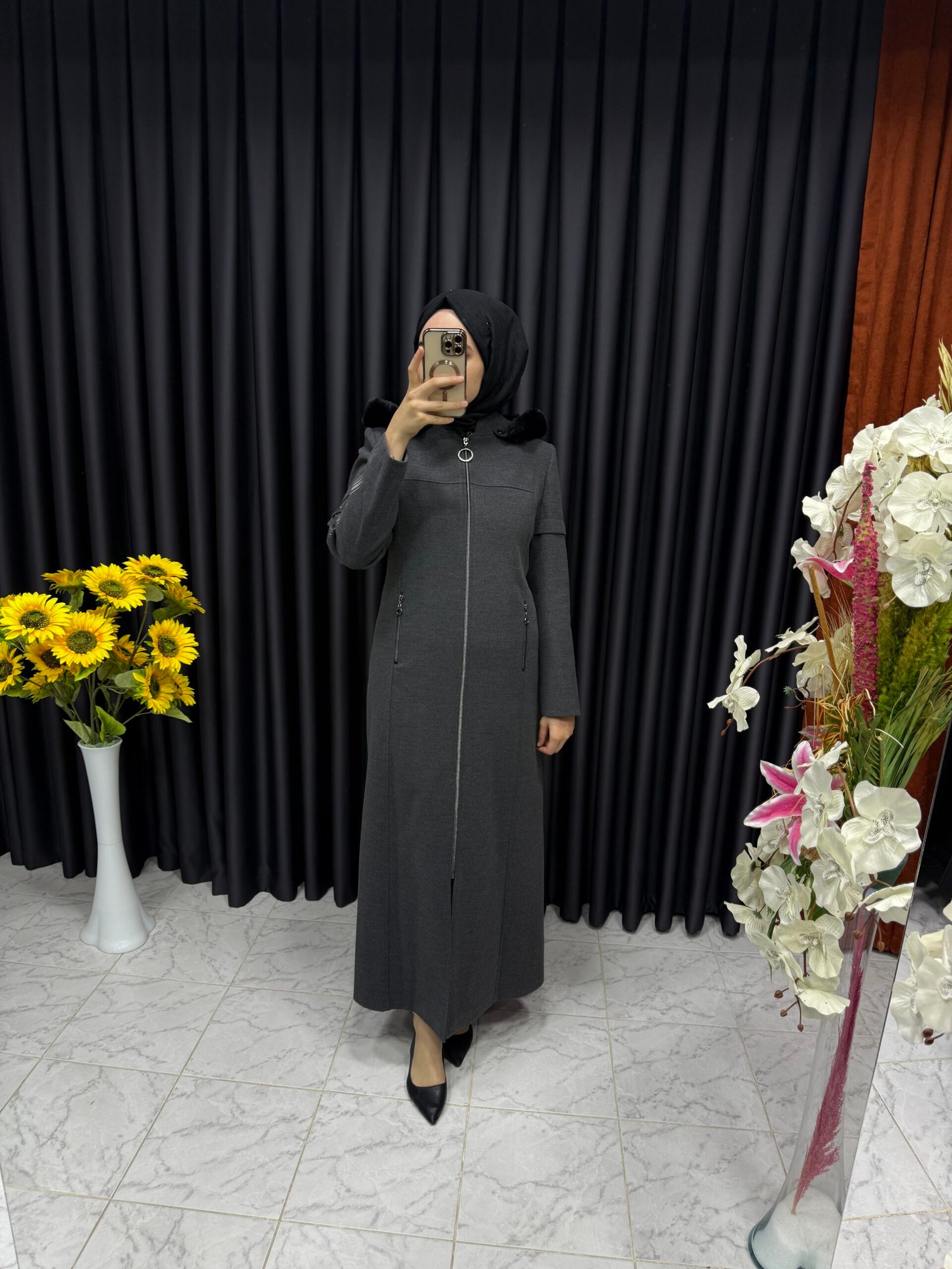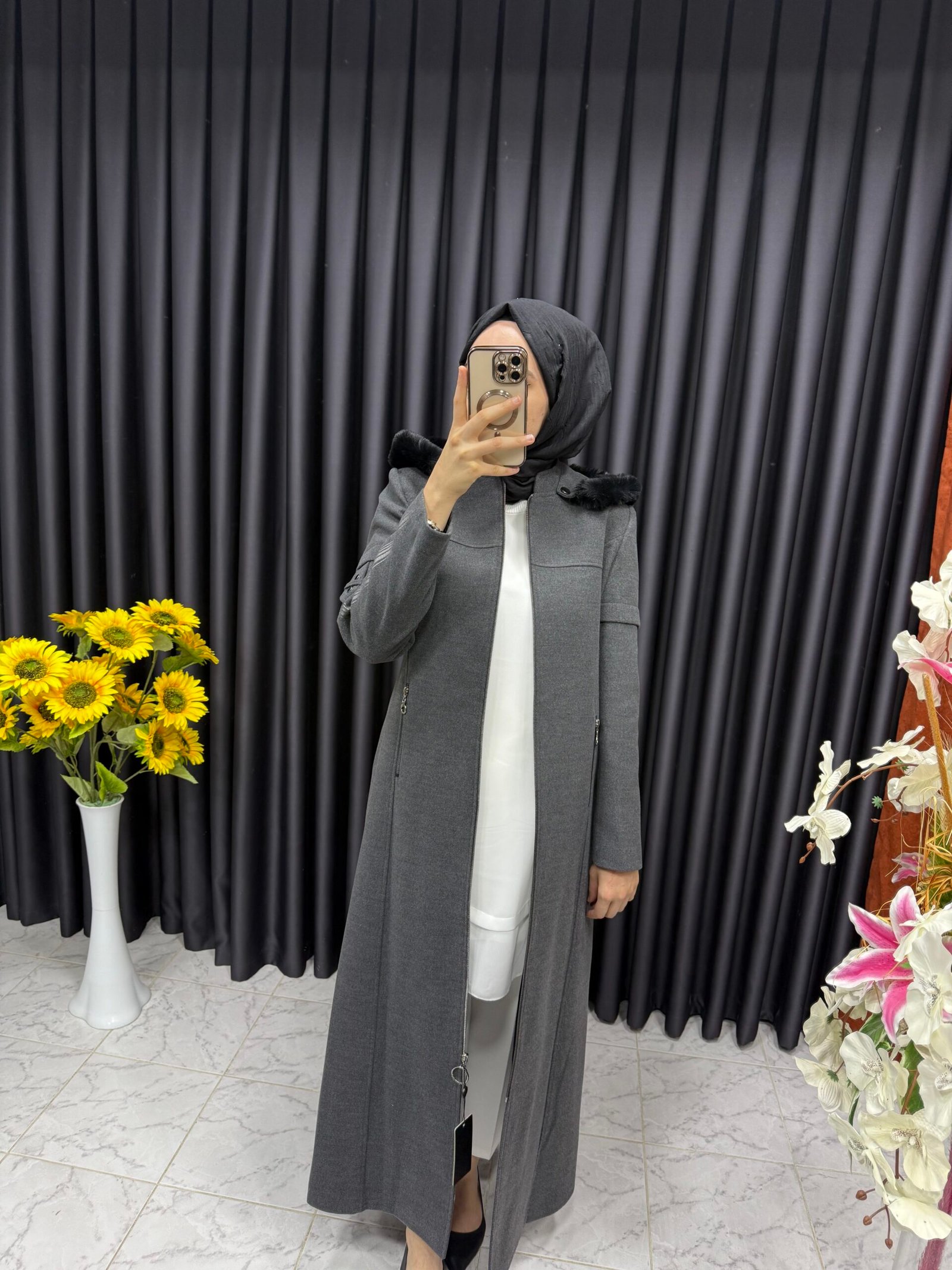 Kolu Şerit Detaylı Kapşonlu Tam Boy Kaşe Kaban Gri