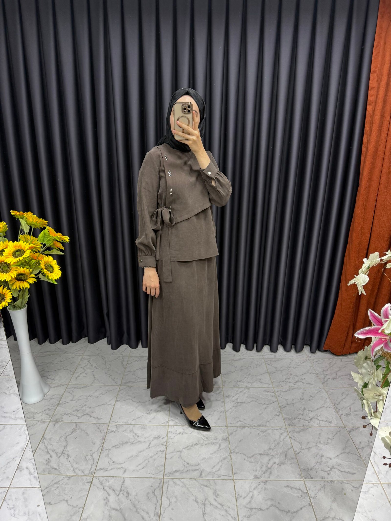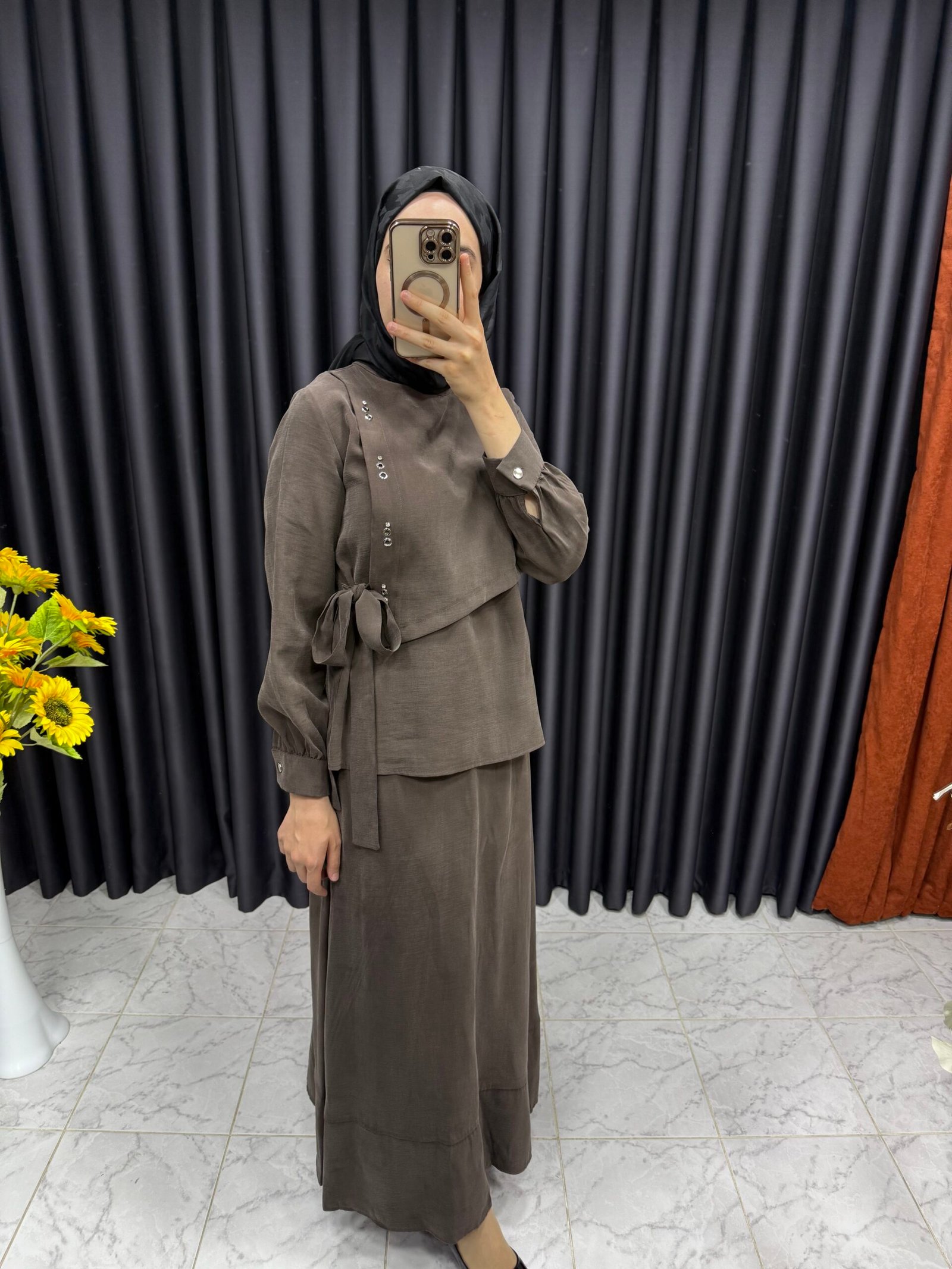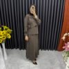 Kuş Gözü Detaylı Yandan Bağlamalı Etekli Takım Kahverengi