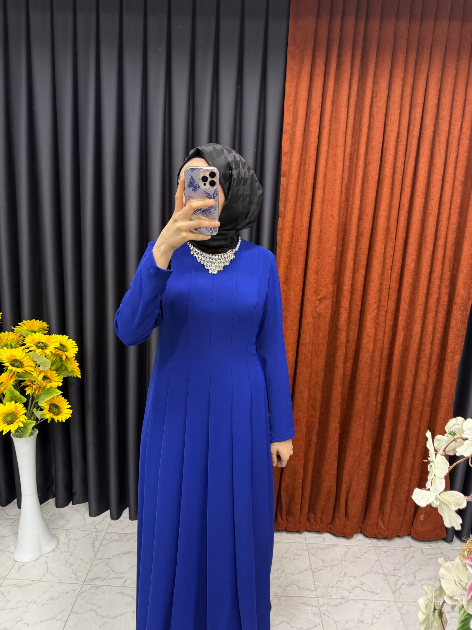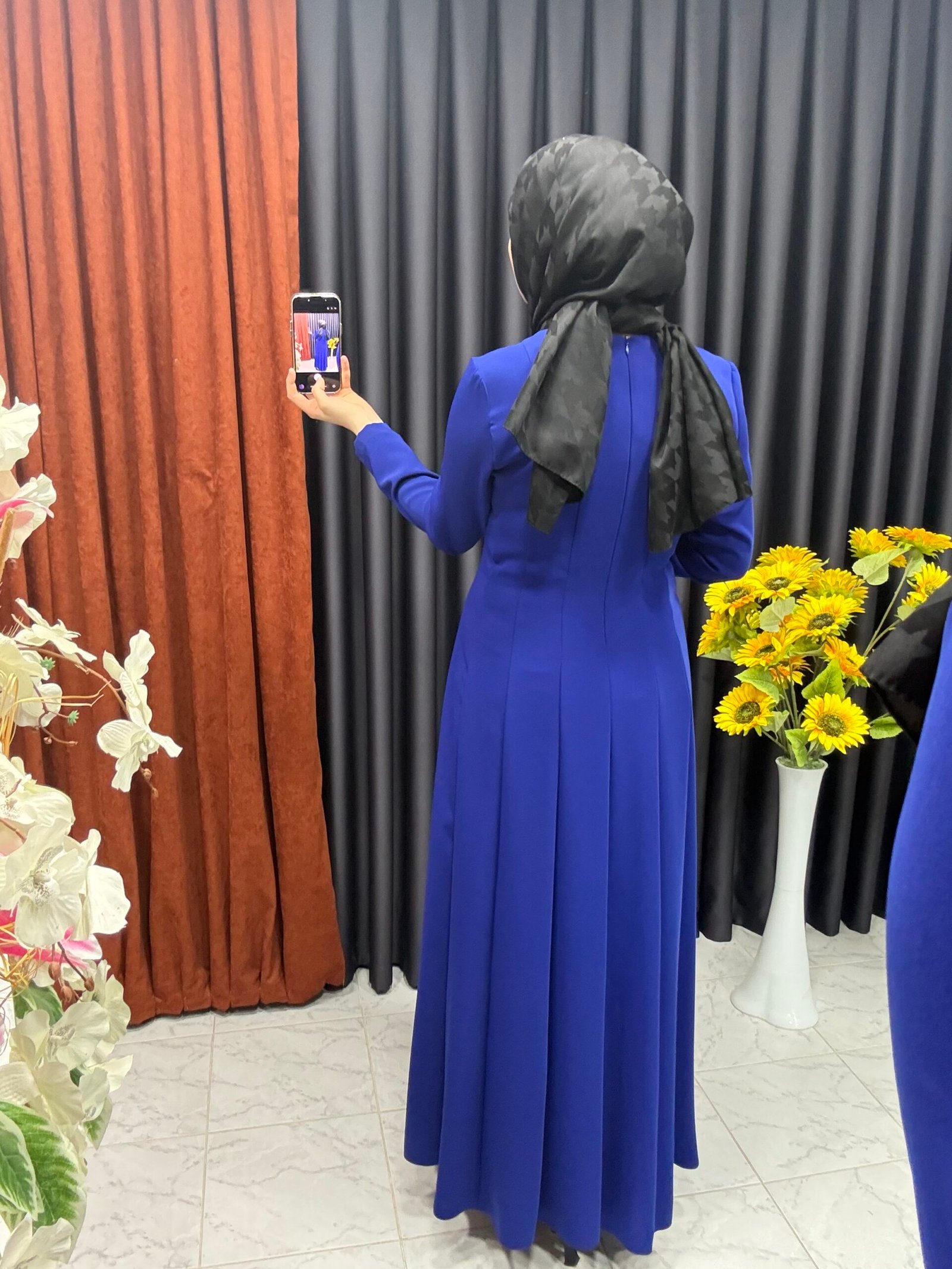 Mevlana Model Pile Detaylı Elbise Saks Mavisi