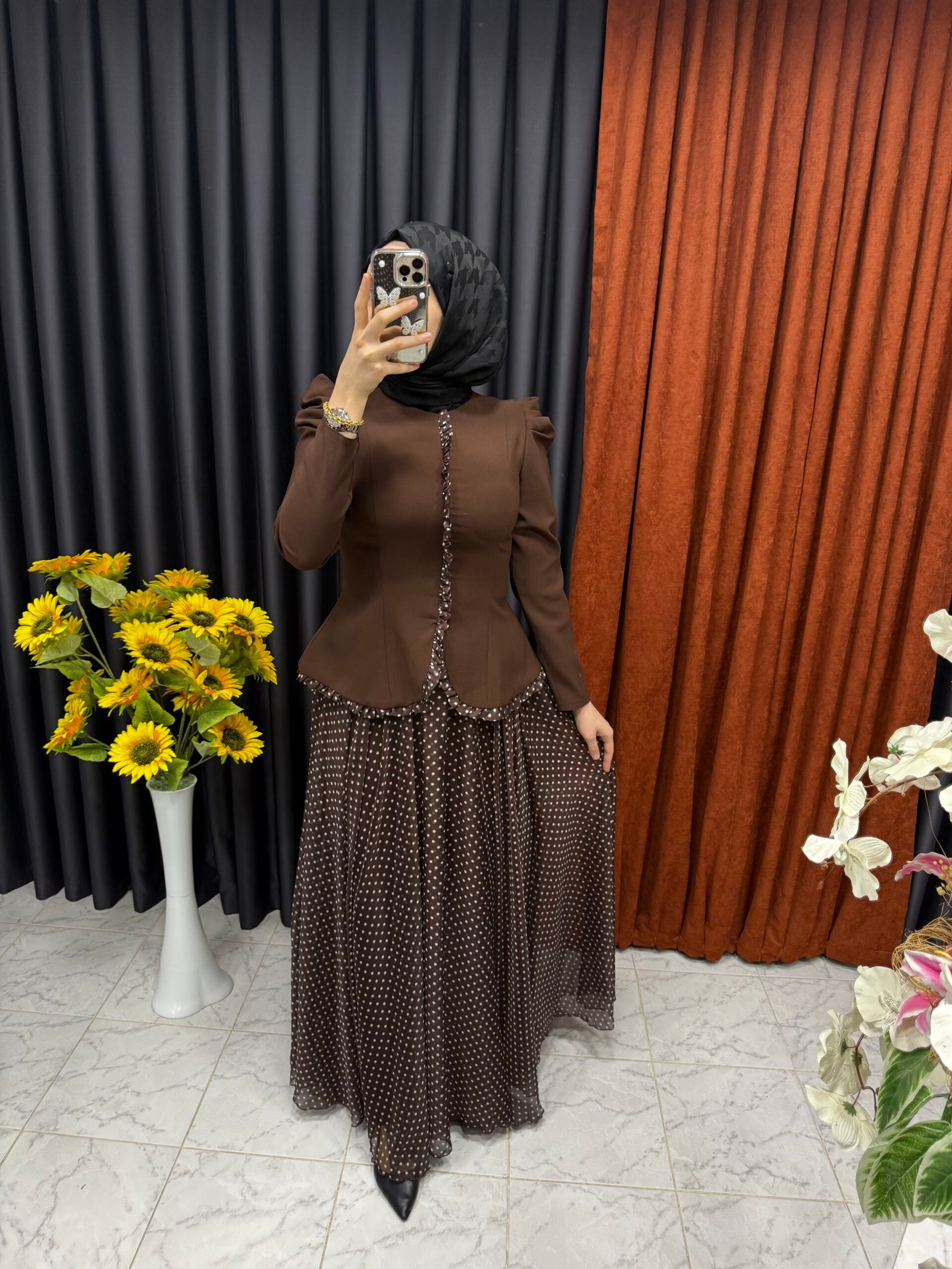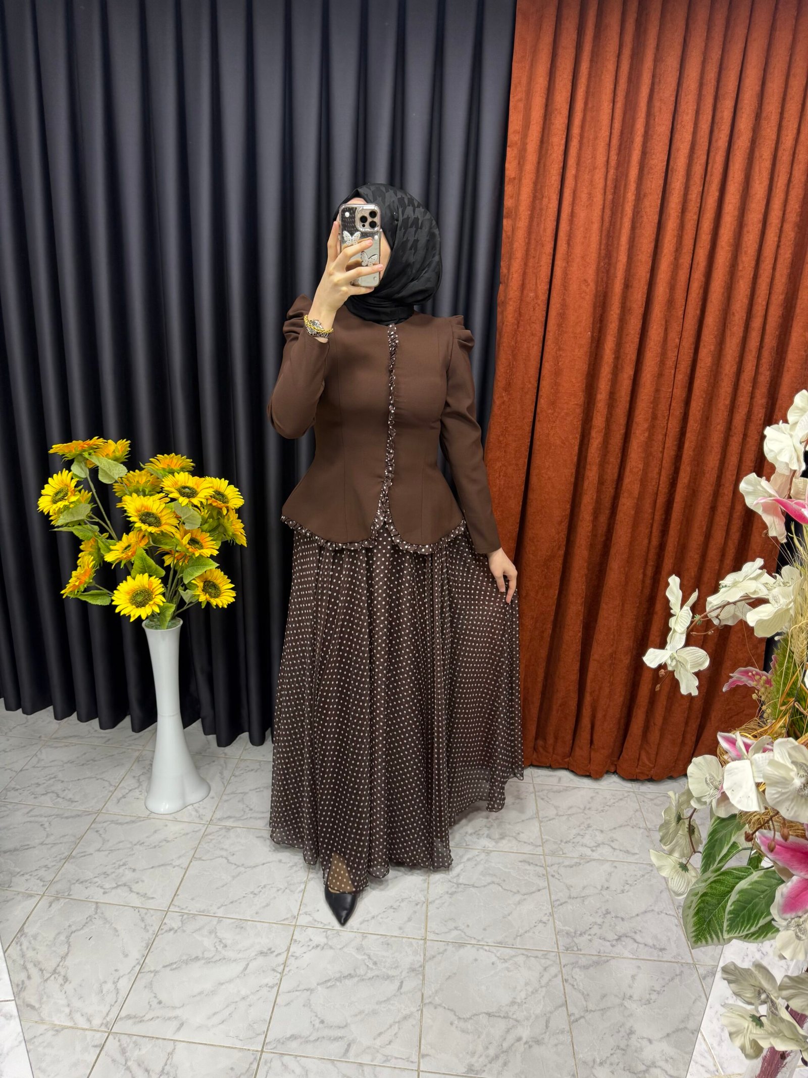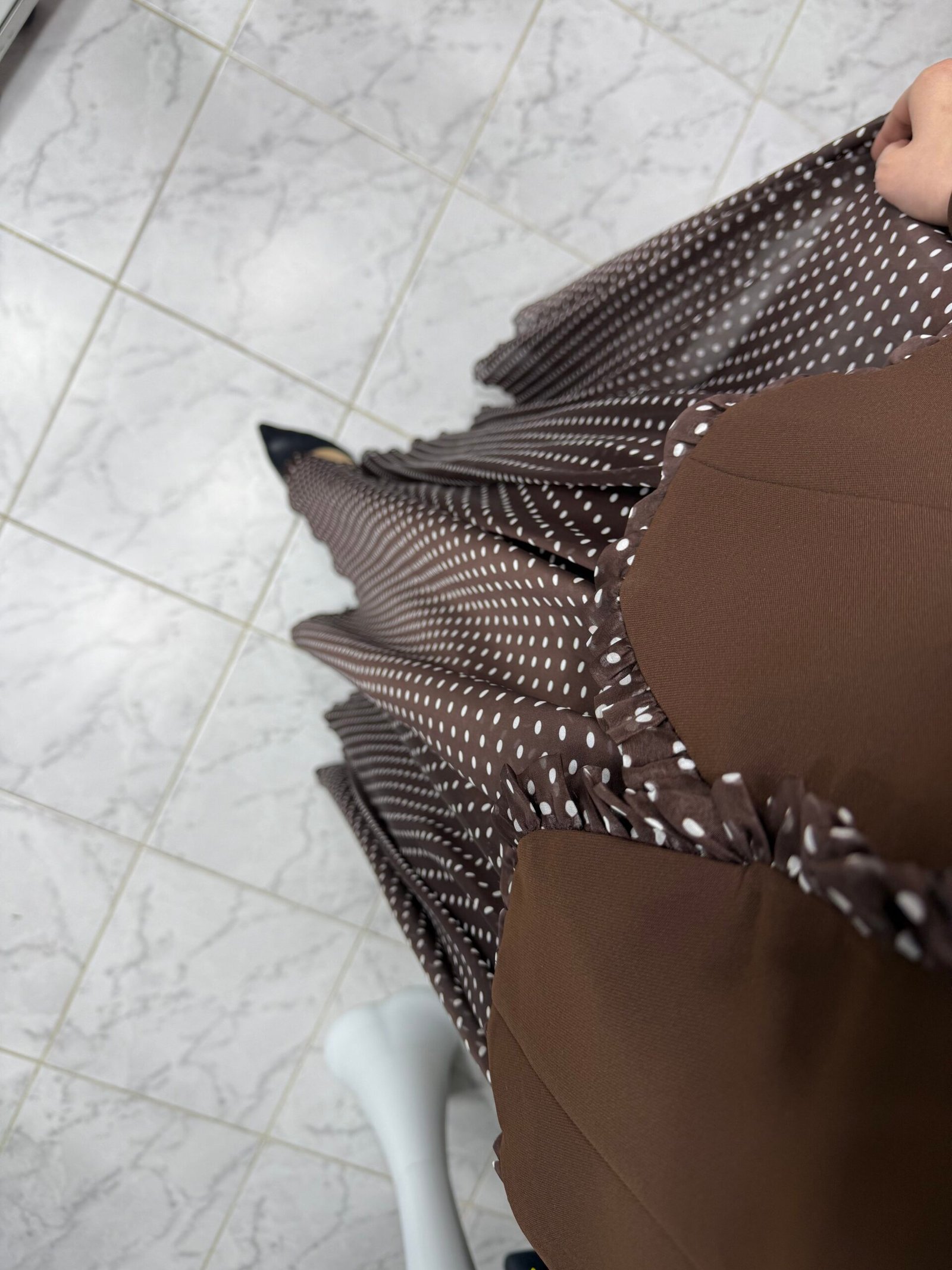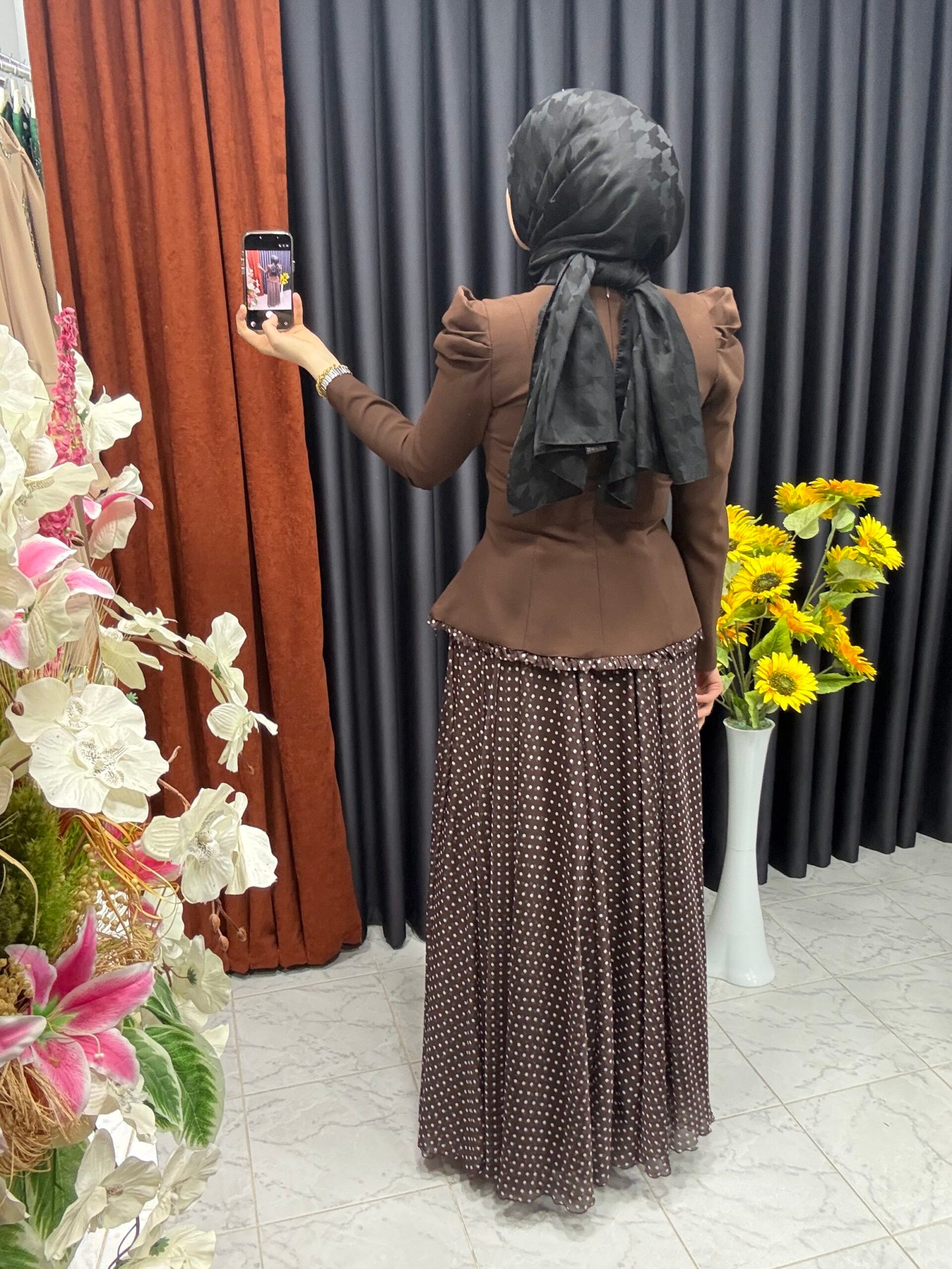 Puantiyeli üstü fırfır detaylı etekli takım, dolabınızdaki en işlevsel parçalar arasına girmeye aday. İster bir davete giderken, ister iş ortamında farklı bir hava yaratmak için kullanabilir, kendi stilinizi rahatça ifade edebilirsiniz. Ayrıca, aksesuarlarla kolayca kombinlenebilen bu takım, sizin kişisel tarzınıza uyum sağlayacak şekilde tasarlandı.