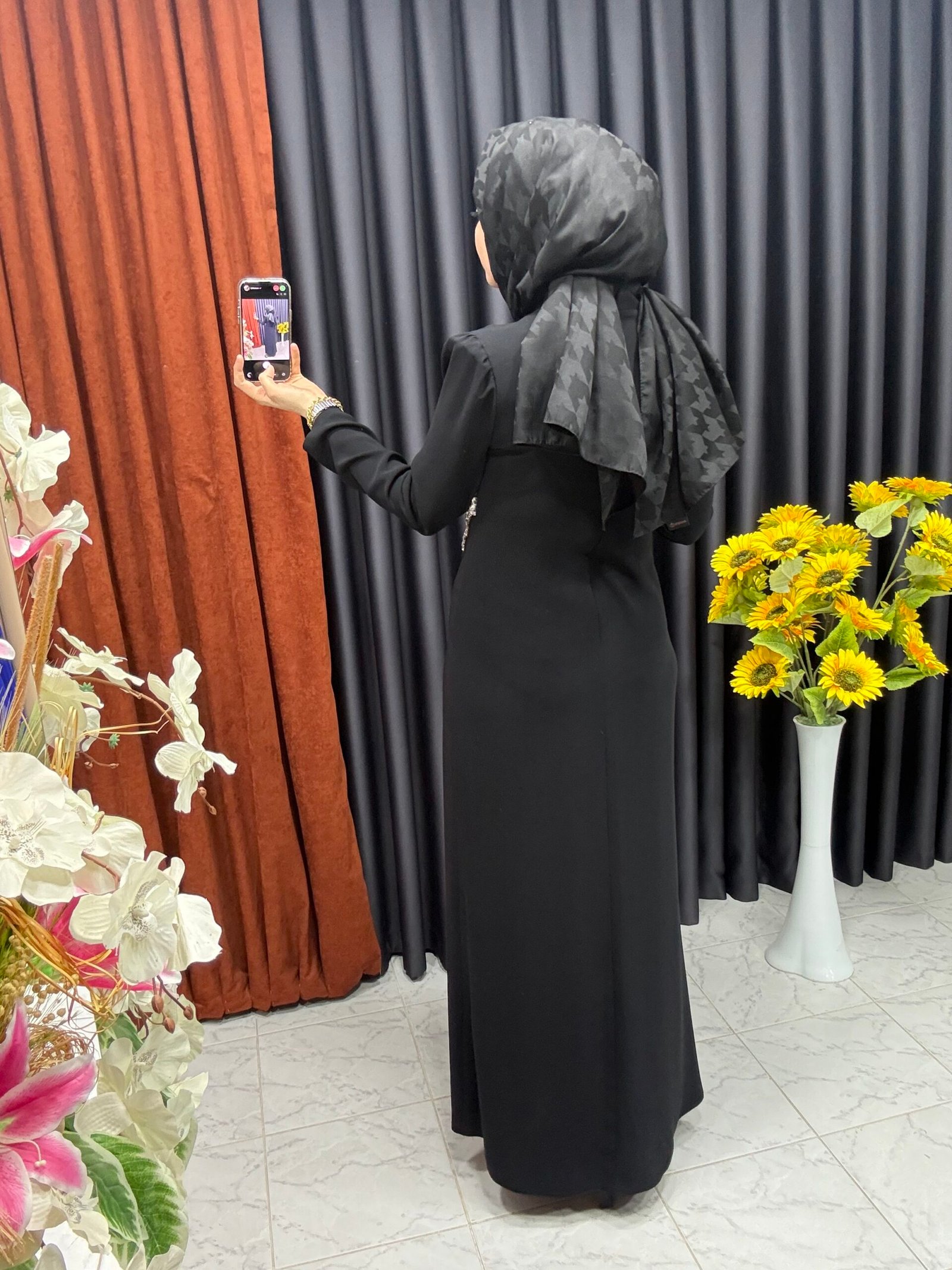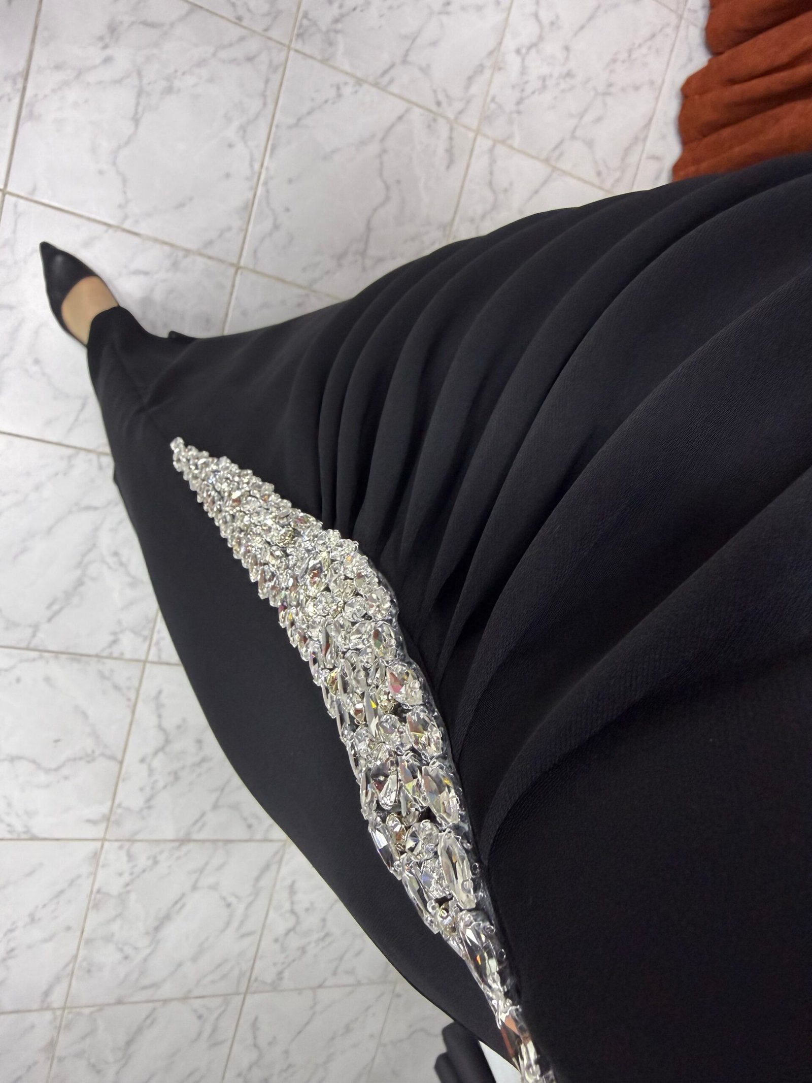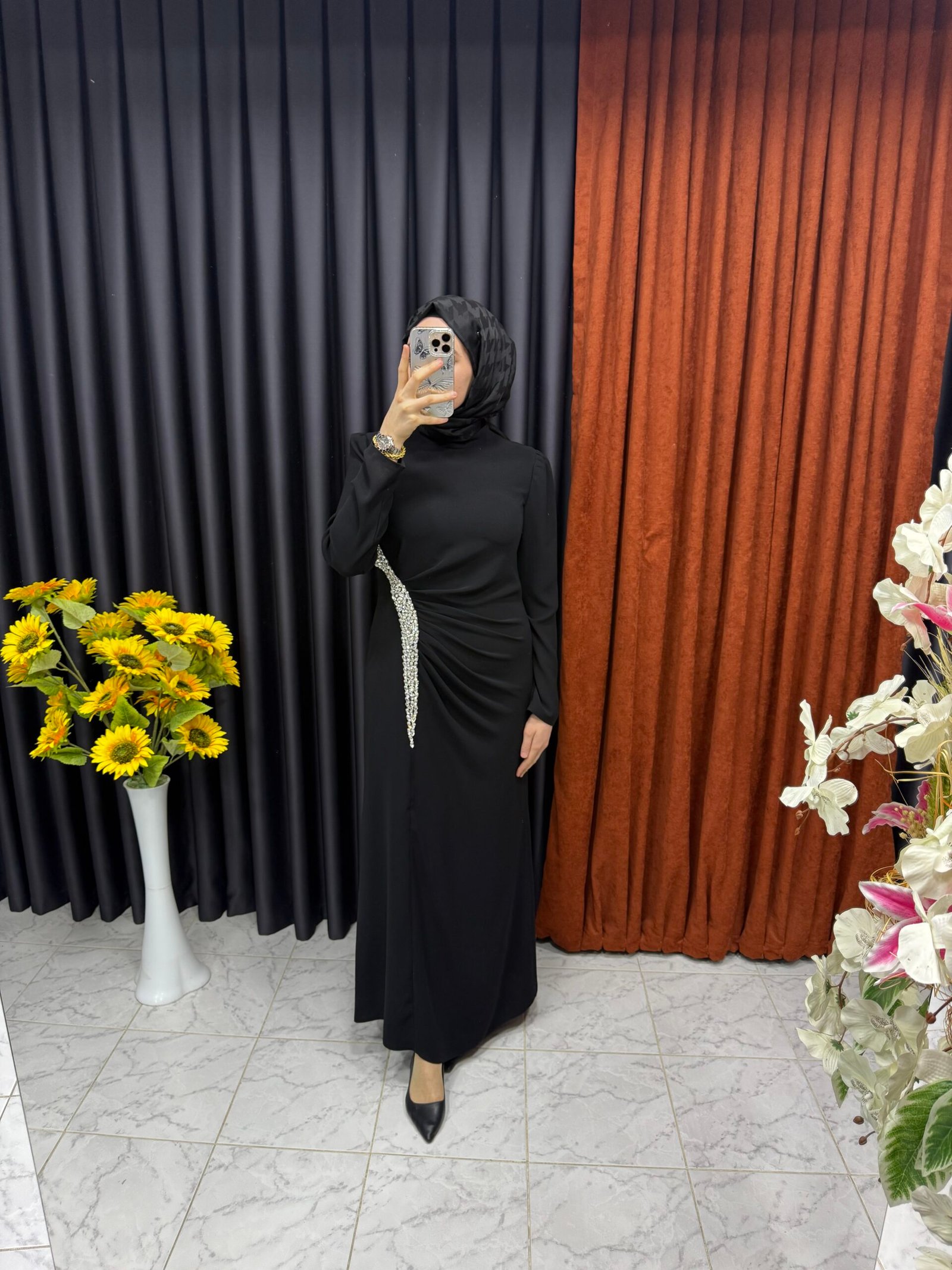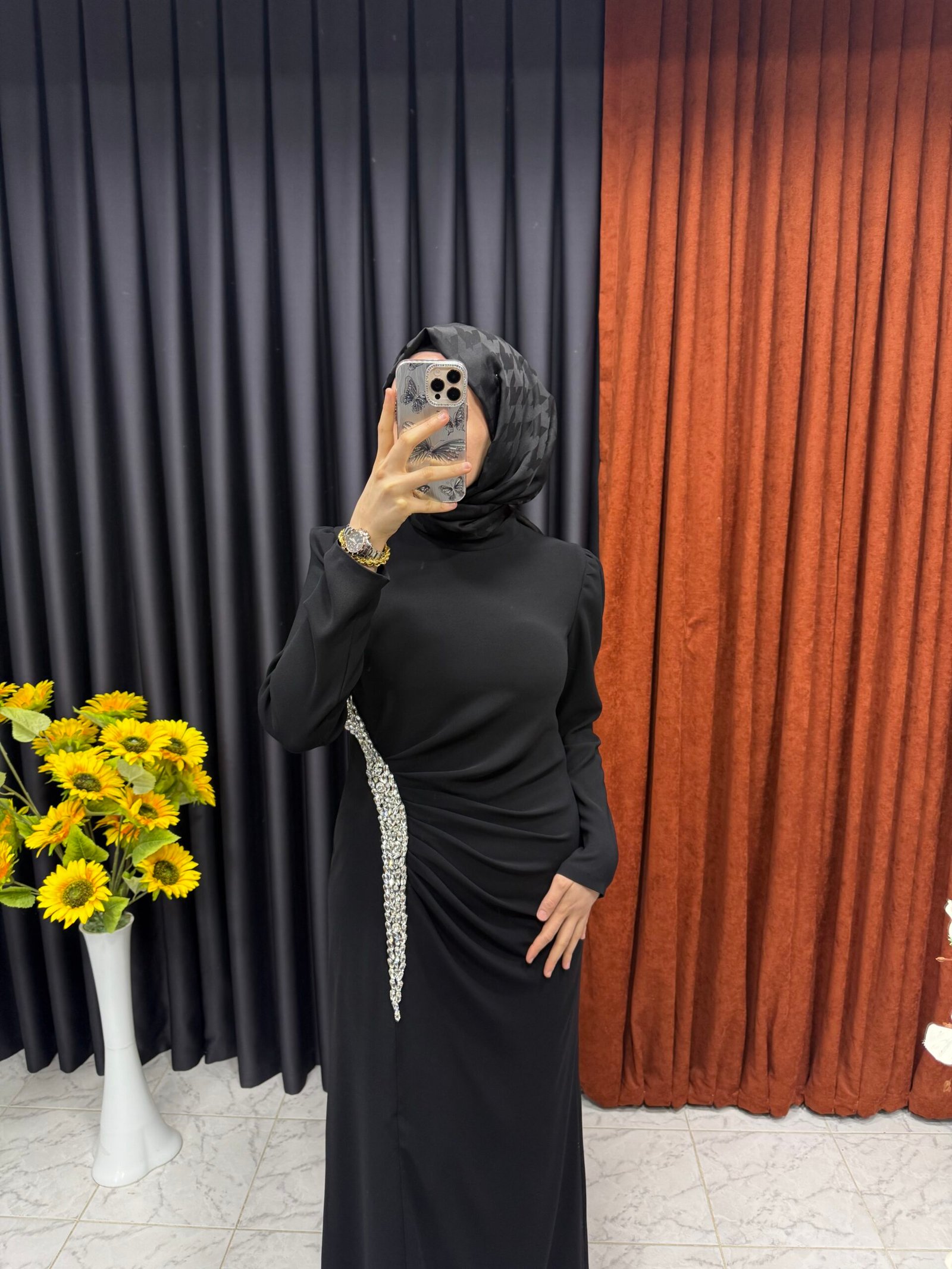 Taş İşlemeli Drape Detaylı Abiye Siyah